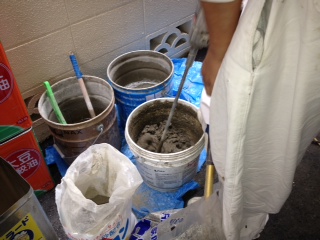 解体、ハツリをして防水処理のあと、写真の用に左官、タイルを貼り、トイレを設置して完成です。